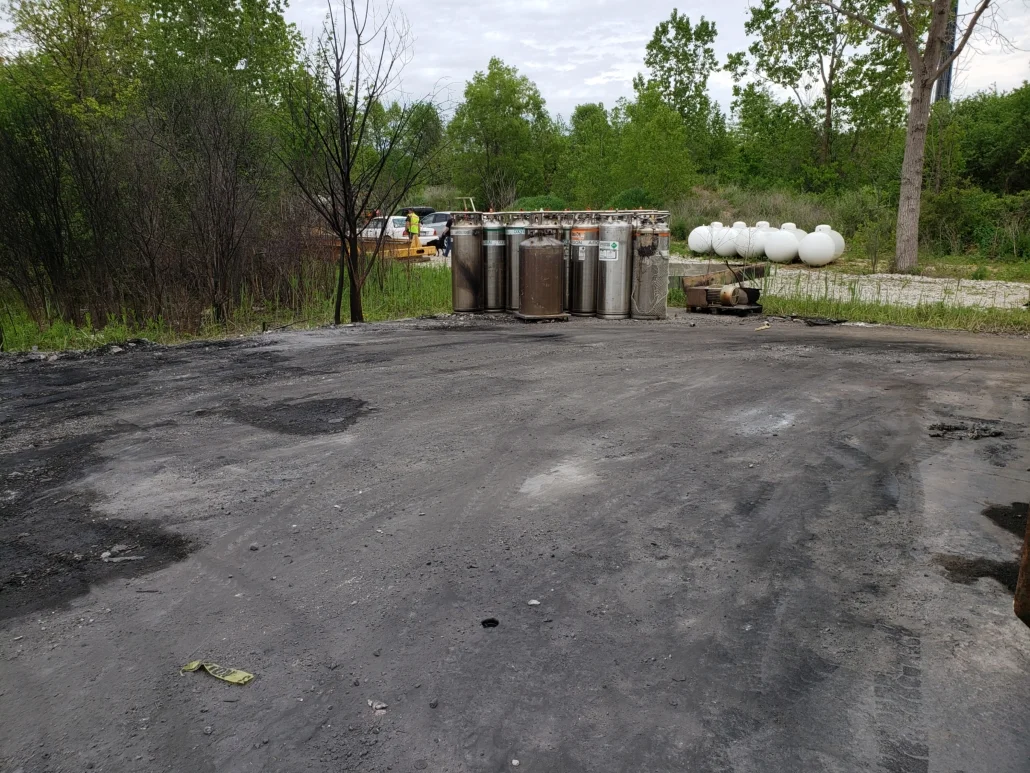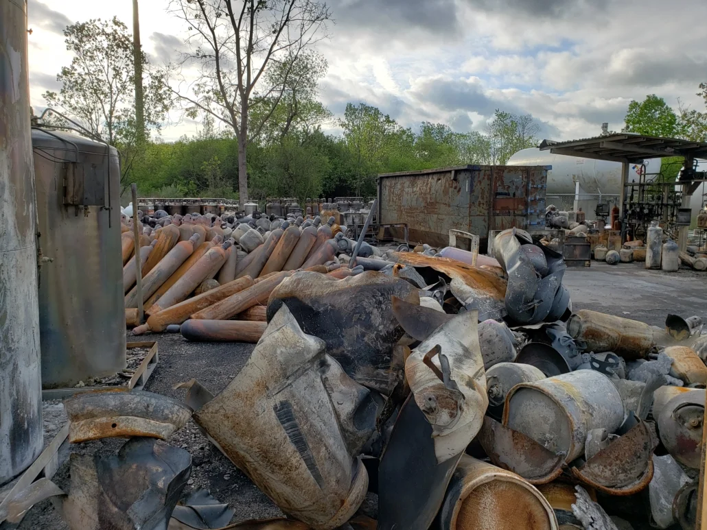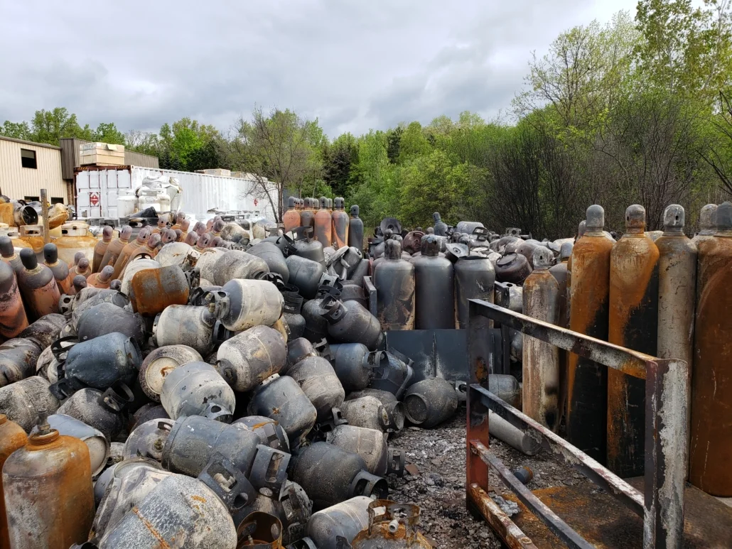 Recently, we completed a cylinder recycling and disposal job for a client of ours who had a fire on their site. The fire burned for 3-4 days and caused major damage but luckily no one was hurt. We were tasked with the job of going through the cylinders to determine which cylinders were considered empty with a visible hole for scrap metal, what could be legally transported for processing at our facility, and the identification and DOT shippability determination of other unknown cylinders. This job was a unique situation for our team of cylinder experts. Due to the fire, it was a challenge to verify which valved cylinders were still hazardous and shippable under DOT guidelines.